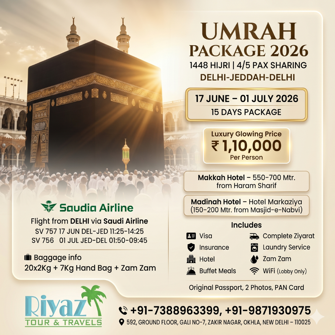 Begin your sacred journey with one of the best Umrah packages from Delhi, India in 2026, exclusively offered by Riyaz Tour and Travels. Our 17 June to 01 July 2026 Umrah package from Delhi is thoughtfully designed for pilgrims who seek a perfect combination of comfort, affordability, and a spiritually enriching experience in the holy cities. This carefully planned Umrah package ensures a smooth and completely hassle-free journey, allowing you to focus entirely on your ibadat while all travel arrangements are handled with professionalism and care. If you are searching for an affordable Umrah package from Delhi June–July 2026, a well-organized Umrah deal, or a trusted and experienced Umrah travel agency, this package is the ideal choice. With a strong commitment to quality service and customer satisfaction, Riyaz Tour and Travels ensures your journey becomes peaceful, memorable, and spiritually fulfilling. Book now and reserve your seat in one of the most in-demand Umrah packages from Delhi, India for 2026.