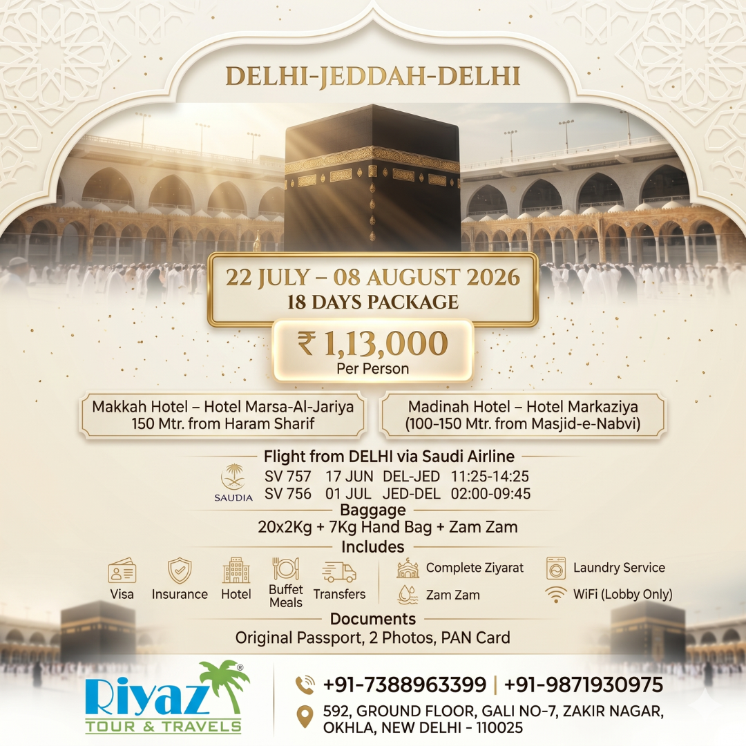 Begin your sacred journey with one of the best Umrah packages from Delhi, India in 2026, exclusively offered by Riyaz Tour and Travels. Our 22 July to 08 August 2026 Umrah package from Delhi is carefully crafted for pilgrims who seek a perfect combination of comfort, affordability, and a spiritually enriching experience in the holy cities. This well-planned Umrah package ensures a smooth and completely hassle-free journey, allowing you to focus entirely on your ibadat while all travel arrangements are managed with professionalism and care. If you are searching for an affordable Umrah package from Delhi July–August 2026, a long-stay Umrah package, or a trusted and experienced Umrah travel agency, this package is the ideal choice. With a strong commitment to quality service and customer satisfaction, Riyaz Tour and Travels ensures your journey becomes peaceful, memorable, and spiritually fulfilling. Book now and reserve your seat in one of the most in-demand Umrah packages from Delhi, India for 2026.