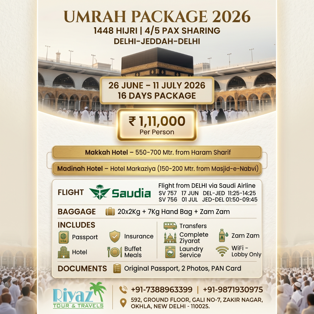 Experience a truly blessed and peaceful journey with one of the best Umrah packages from Delhi, India in 2026, exclusively offered by Riyaz Tour and Travels. Our 26 June to 11 July 2026 Umrah package from Delhi is carefully crafted for pilgrims who seek a perfect balance of comfort, affordability, and a spiritually fulfilling experience in the holy cities. This well-organized Umrah package ensures a smooth and completely hassle-free journey, allowing you to focus entirely on your ibadat while all travel arrangements are managed with professionalism and care. If you are searching for an affordable Umrah package from Delhi June–July 2026, a long-duration Umrah package, or a trusted and experienced Umrah travel agency, this package is the ideal choice. With a strong commitment to quality service and customer satisfaction, Riyaz Tour and Travels ensures your journey becomes peaceful, memorable, and spiritually enriching. Book now and secure your seat in one of the most preferred Umrah packages from Delhi, India for 2026.