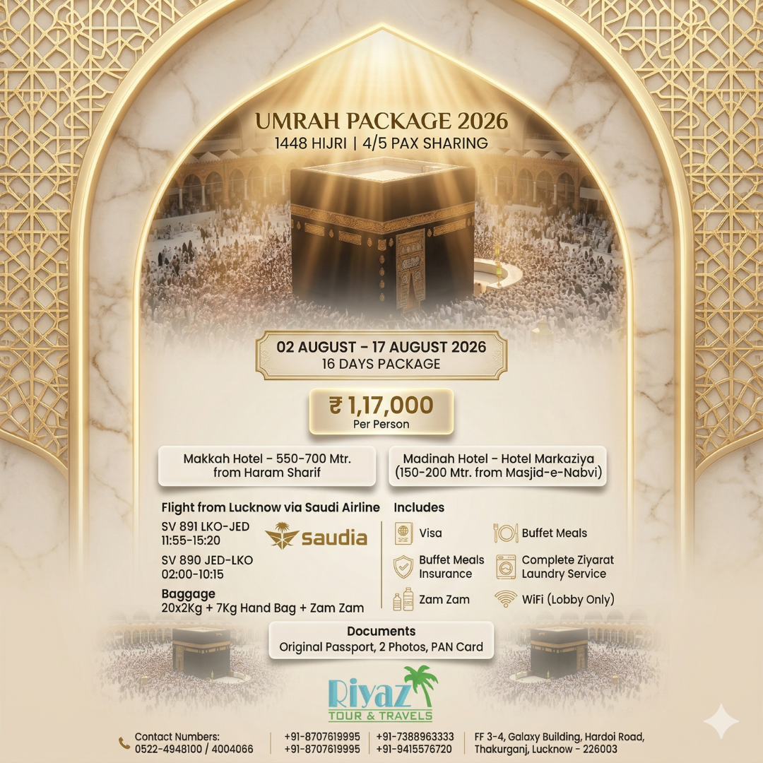 Make your spiritual journey truly special with one of the top Umrah packages from Lucknow, India in 2026, exclusively offered by Riyaz Tour and Travels. Our 02 August to 17 August 2026 Umrah package from Lucknow is thoughtfully planned for pilgrims who seek a smooth, comfortable, and spiritually enriching experience in the holy cities. This Umrah package is designed to eliminate all travel stress, allowing you to focus completely on your ibadat while every arrangement is handled with care and professionalism. If you are searching for an affordable Umrah package from Lucknow August 2026, a long-duration Umrah journey, or a trusted and experienced Umrah travel agency, this package is an excellent choice. With our commitment to quality service and customer satisfaction, Riyaz Tour and Travels ensures your journey is peaceful, memorable, and truly fulfilling. Book now and secure your place in one of the most preferred Umrah packages from Lucknow, India for 2026.