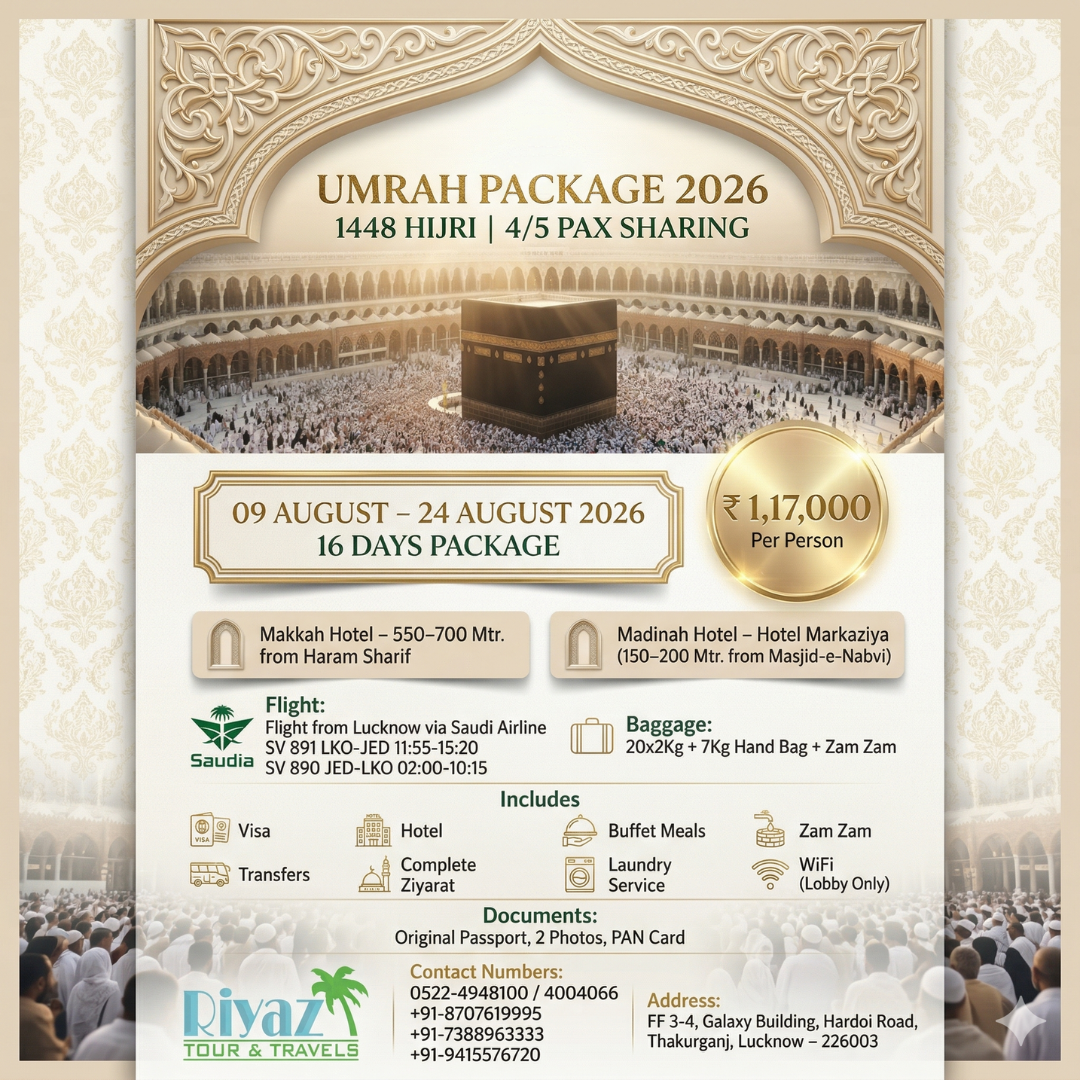 Step into a deeply spiritual and peaceful journey with one of the best Umrah packages from Lucknow, India in 2026, proudly offered by Riyaz Tour and Travels. Our 09 August to 24 August 2026 Umrah package from Lucknow is carefully crafted for pilgrims who seek a perfect mix of comfort, affordability, and a truly enriching ibadat experience in the holy cities. Every aspect of this journey is managed with precision to ensure a smooth and hassle-free travel experience, allowing you to fully focus on your prayers without any worries. If you are looking for an affordable Umrah package from Lucknow August 2026, a well-planned long-stay Umrah package, or a reliable and experienced Umrah travel agency, this package is the perfect choice. With a strong commitment to quality service and customer satisfaction, Riyaz Tour and Travels ensures your sacred journey becomes memorable, peaceful, and spiritually fulfilling. Book now and reserve your seat in one of the most in-demand Umrah packages from Lucknow, India for 2026.