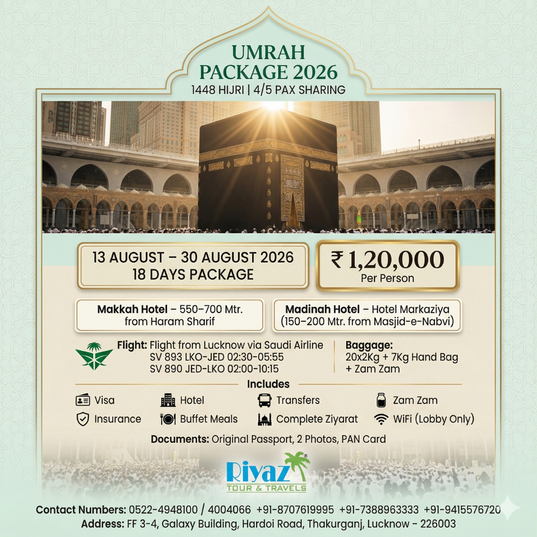 Begin a peaceful and spiritually uplifting journey with one of the top Umrah packages from Lucknow, India in 2026, exclusively offered by Riyaz Tour and Travels. Our 13 August to 30 August 2026 Umrah package from Lucknow is carefully designed for pilgrims who seek comfort, affordability, and a deeply fulfilling ibadat experience in the holy cities. This well-organized Umrah package ensures a smooth and completely stress-free journey, allowing you to focus entirely on your prayers while every arrangement is handled with professionalism and care. If you are searching for an affordable Umrah package from Lucknow August 2026, a long-stay Umrah package, or a trusted and experienced Umrah travel agency, this package is the perfect choice. With a strong commitment to quality service and customer satisfaction, Riyaz Tour and Travels ensures your sacred journey becomes memorable, peaceful, and spiritually enriching. Book now and secure your seat in one of the most in-demand Umrah packages from Lucknow, India for 2026.