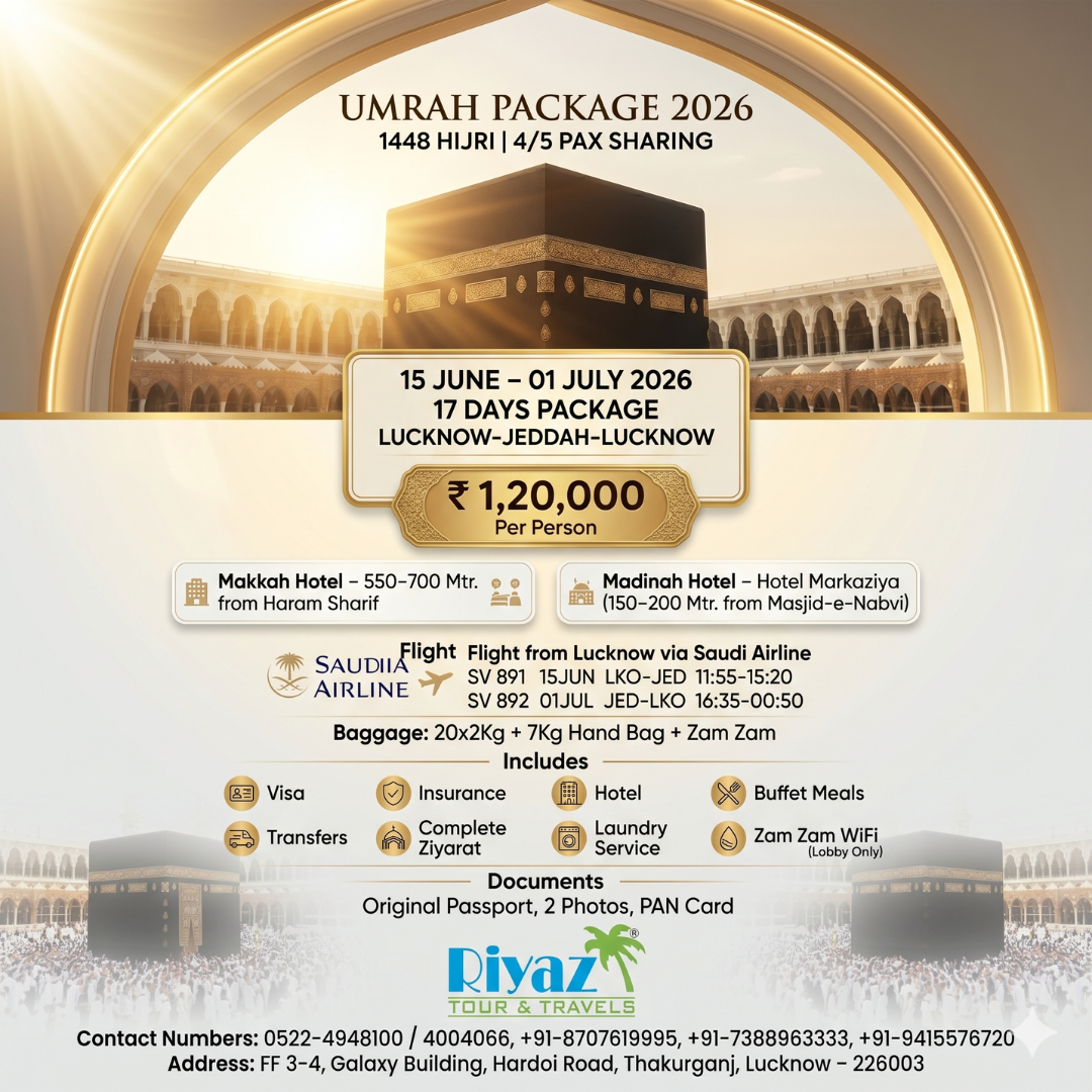 Start your sacred journey with one of the best Umrah packages from Lucknow, India in 2026, exclusively offered by Riyaz Tour and Travels. Our 15 June to 01 July 2026 Umrah package from Lucknow is thoughtfully designed for pilgrims who seek a perfect blend of comfort, affordability, and a spiritually enriching experience in the holy cities. This carefully planned Umrah package ensures a smooth and completely hassle-free journey, allowing you to focus entirely on your ibadat while all travel arrangements are handled with professionalism and care. If you are searching for an affordable Umrah package from Lucknow June–July 2026, a long-duration Umrah journey, or a trusted and experienced Umrah travel agency in Lucknow, this package is the ideal choice. With a strong commitment to quality service and customer satisfaction, Riyaz Tour and Travels ensures your journey becomes peaceful, memorable, and spiritually fulfilling. Book now and reserve your seat in one of the most in-demand Umrah packages from Lucknow, India for 2026.