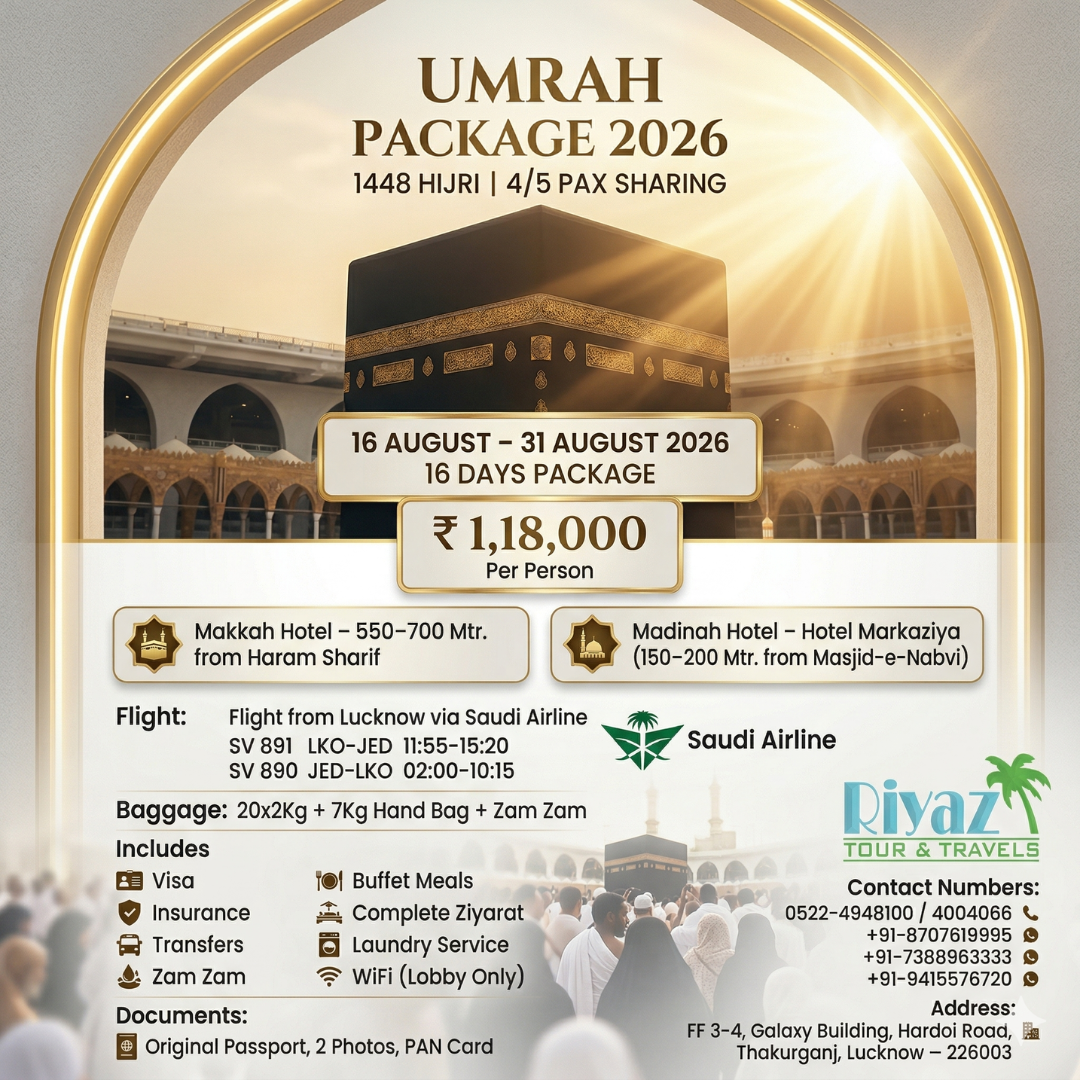 Experience a truly peaceful and spiritually rewarding journey with one of the best Umrah packages from Lucknow, India in 2026, exclusively brought to you by Riyaz Tour and Travels. Our 16 August to 31 August 2026 Umrah package from Lucknow is thoughtfully crafted for pilgrims who seek a perfect balance of comfort, affordability, and a meaningful ibadat experience in the holy cities. This carefully planned Umrah package ensures a smooth and completely hassle-free journey, allowing you to focus entirely on your prayers while all travel arrangements are handled with professionalism and care. If you are searching for an affordable Umrah package from Lucknow August 2026, a well-organized long-duration Umrah plan, or a trusted and experienced Umrah travel agency, this package is an ideal choice. With a strong commitment to quality service and customer satisfaction, Riyaz Tour and Travels ensures your journey becomes peaceful, memorable, and spiritually fulfilling. Book now and reserve your seat in one of the most preferred Umrah packages from Lucknow, India for 2026.