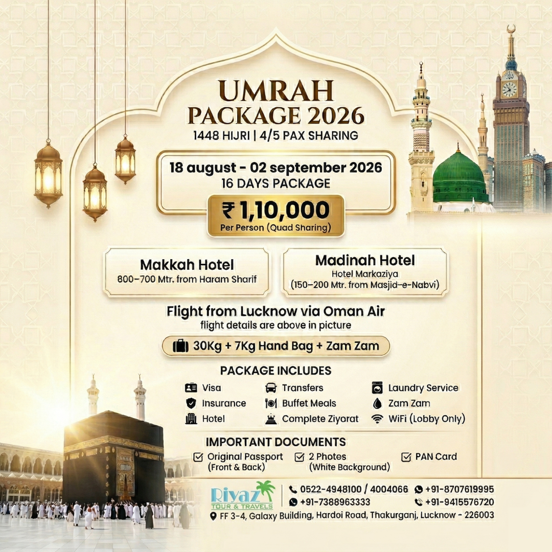 Experience a peaceful and spiritually uplifting journey with one of the best Umrah packages from Lucknow, India in 2026, exclusively offered by Riyaz Tour and Travels. Our 18 August to 02 September 2026 Umrah package from Lucknow is thoughtfully designed for pilgrims who seek comfort, affordability, and a seamless ibadat experience in the holy cities. This carefully planned Umrah package ensures a smooth and completely hassle-free journey, allowing you to focus entirely on your prayers while every essential arrangement is managed with professionalism and care. If you are searching for an affordable Umrah package from Lucknow August–September 2026, a long-duration Umrah deal, or a trusted and experienced Umrah travel agency, this package is the perfect choice. With a strong commitment to quality service and customer satisfaction, Riyaz Tour and Travels ensures your sacred journey becomes memorable, comfortable, and spiritually enriching. Book now and secure your seat in one of the most in-demand Umrah packages from Lucknow, India for 2026.