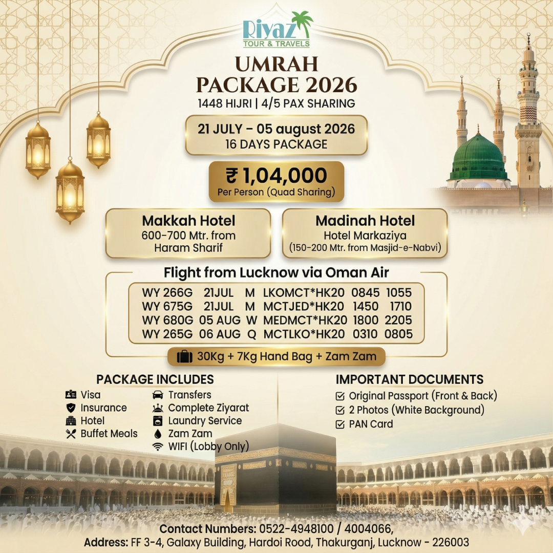 Embark on a blessed and spiritually fulfilling journey with one of the best Umrah packages from Lucknow, India in 2026, exclusively offered by Riyaz Tour and Travels. Our 21 July to 05 August 2026 Umrah package from Lucknow is thoughtfully designed for pilgrims who seek a perfect balance of comfort, affordability, and a peaceful ibadat experience in the holy cities. This carefully planned Umrah package ensures a smooth and completely hassle-free journey, allowing you to focus entirely on your prayers while all travel arrangements are managed with professionalism and care. If you are searching for an affordable Umrah package from Lucknow July–August 2026, a long-duration Umrah deal, or a trusted and experienced Umrah travel agency, this package is an ideal choice. With a strong commitment to quality service and customer satisfaction, Riyaz Tour and Travels ensures your sacred journey becomes memorable, comfortable, and spiritually enriching. Book now and secure your seat in one of the most in-demand Umrah packages from Lucknow, India for 2026.