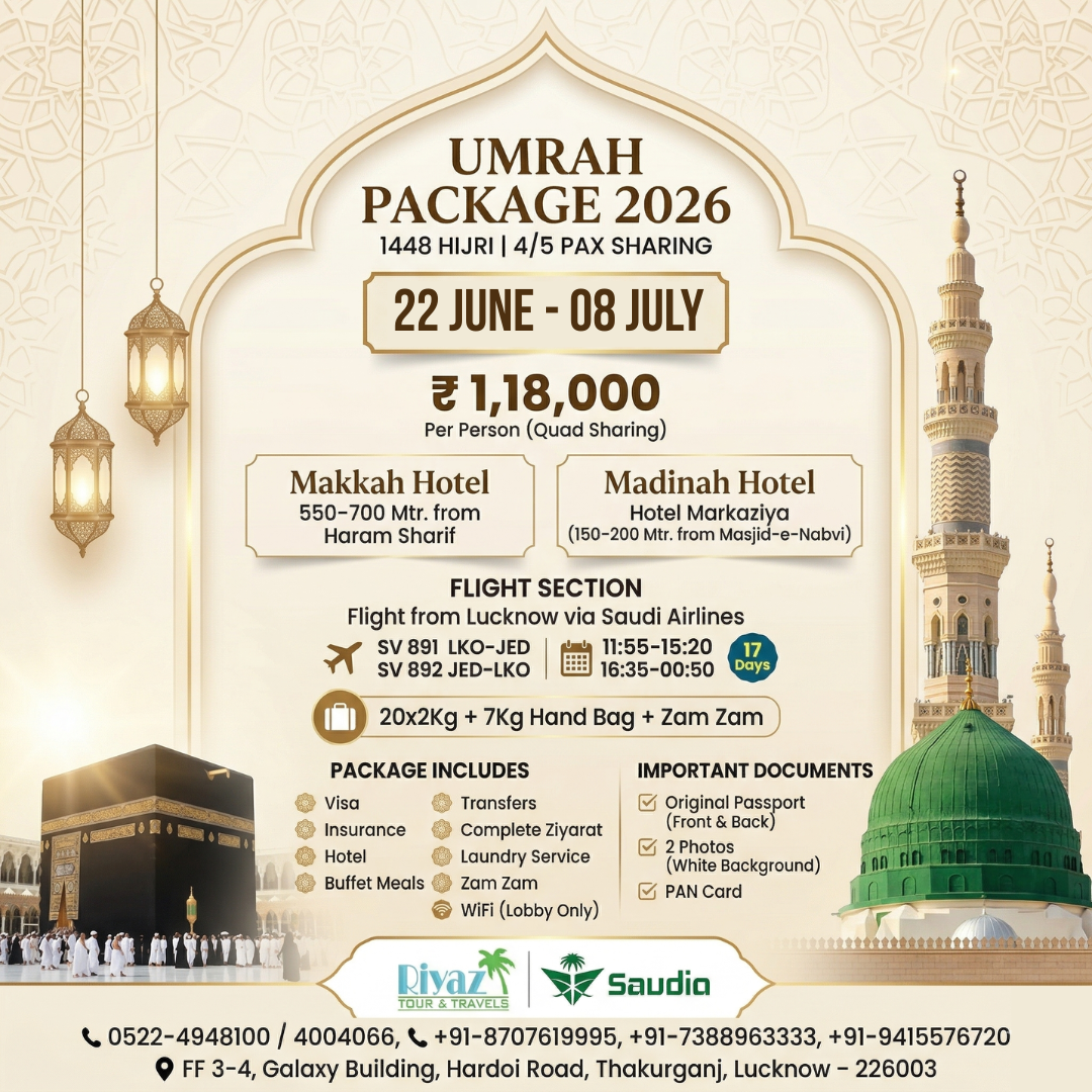 Begin your sacred journey with one of the best Umrah packages from Lucknow, India in 2026, exclusively offered by Riyaz Tour and Travels. Our 22 June to 08 July 2026 Umrah package from Lucknow is carefully designed for pilgrims who seek a perfect balance of comfort, affordability, and a deeply spiritual experience in the holy cities. This well-planned Umrah package ensures a smooth and completely hassle-free journey, allowing you to focus entirely on your ibadat while all travel arrangements are handled with professionalism and care. If you are searching for an affordable Umrah package from Lucknow June–July 2026, a well-organized Umrah deal, or a trusted and experienced Umrah travel agency, this package is the ideal choice. With a strong commitment to quality service and customer satisfaction, Riyaz Tour and Travels ensures your journey remains peaceful, memorable, and spiritually fulfilling. Book now and reserve your seat in one of the most in-demand Umrah packages from Lucknow, India for 2026.