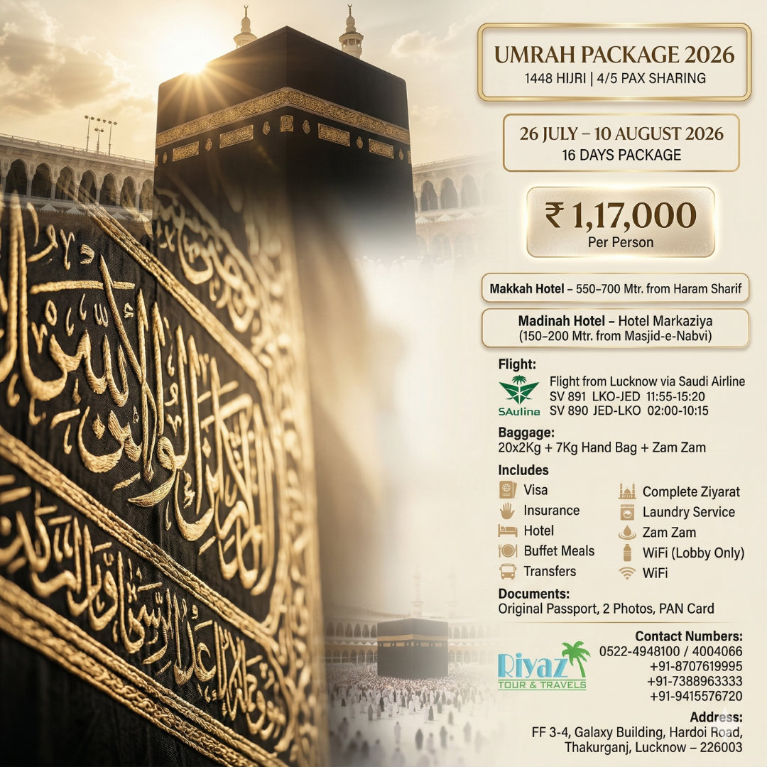Begin your sacred journey with one of the best Umrah packages from Lucknow, India in 2026, exclusively offered by Riyaz Tour and Travels. Our 26 July to 10 August 2026 Umrah package from Lucknow is thoughtfully designed for pilgrims who seek a perfect combination of comfort, affordability, and a spiritually fulfilling experience in the holy cities. This carefully planned Umrah package ensures a smooth and completely hassle-free journey, allowing you to focus entirely on your ibadat while every essential arrangement is handled with professionalism and care. If you are searching for an affordable Umrah package from Lucknow July–August 2026, a long-stay Umrah package, or a trusted and experienced Umrah travel agency, this package is the ideal choice. With a strong commitment to quality service and customer satisfaction, Riyaz Tour and Travels ensures your journey becomes peaceful, memorable, and spiritually enriching. Book now and reserve your seat in one of the most in-demand Umrah packages from Lucknow, India for 2026.