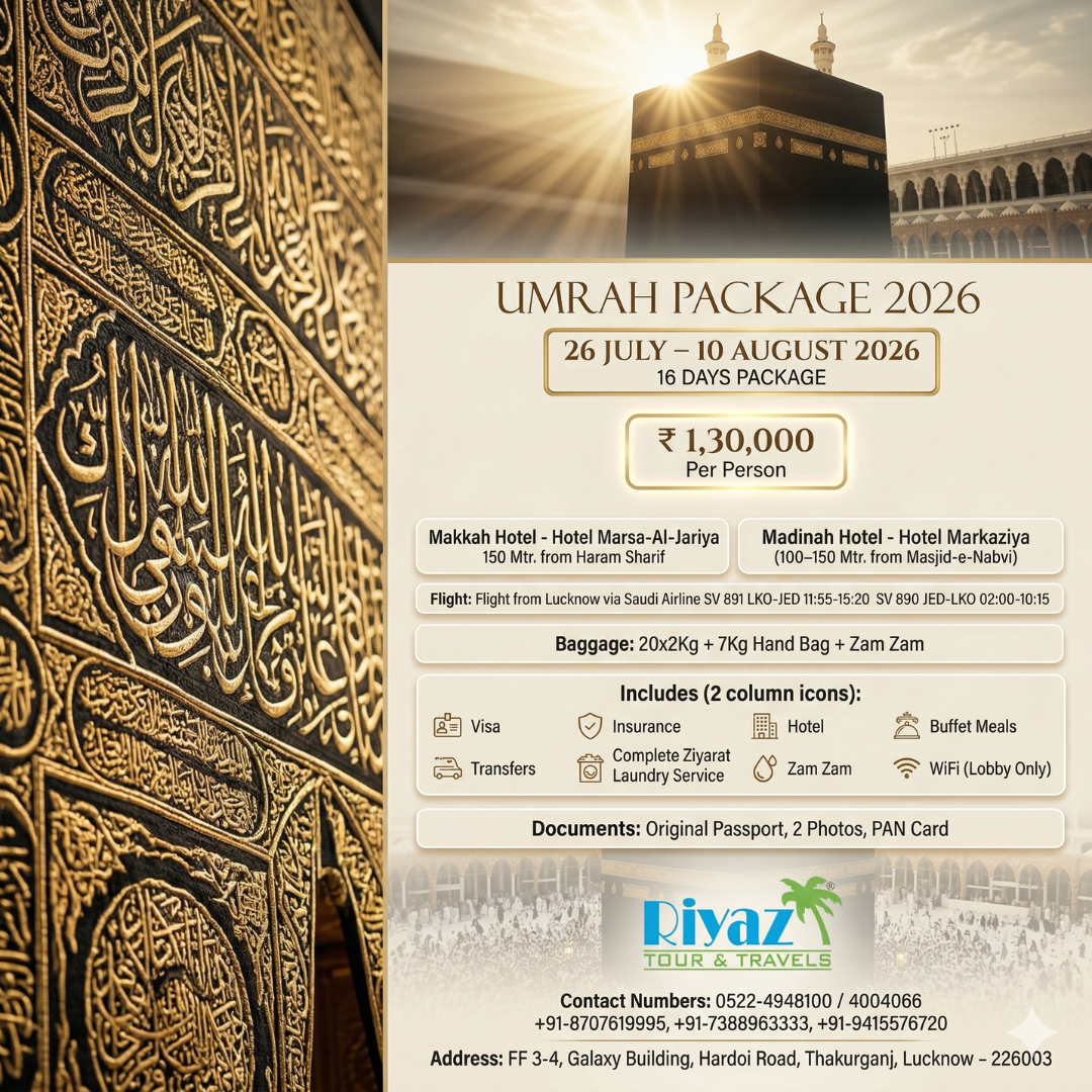 Begin your sacred journey with one of the best Umrah packages from Lucknow, India in 2026, exclusively offered by Riyaz Tour and Travels. Our 26 July to 10 August 2026 Umrah package from Lucknow is thoughtfully designed for pilgrims who seek a perfect combination of comfort, affordability, and a spiritually fulfilling experience in the holy cities. This carefully planned Umrah package ensures a smooth and completely hassle-free journey, allowing you to focus entirely on your ibadat while every essential arrangement is handled with professionalism and care. If you are searching for an affordable Umrah package from Lucknow July–August 2026, a long-stay Umrah package, or a trusted and experienced Umrah travel agency, this package is the ideal choice. With a strong commitment to quality service and customer satisfaction, Riyaz Tour and Travels ensures your journey becomes peaceful, memorable, and spiritually enriching. Book now and reserve your seat in one of the most in-demand Umrah packages from Lucknow, India for 2026.
